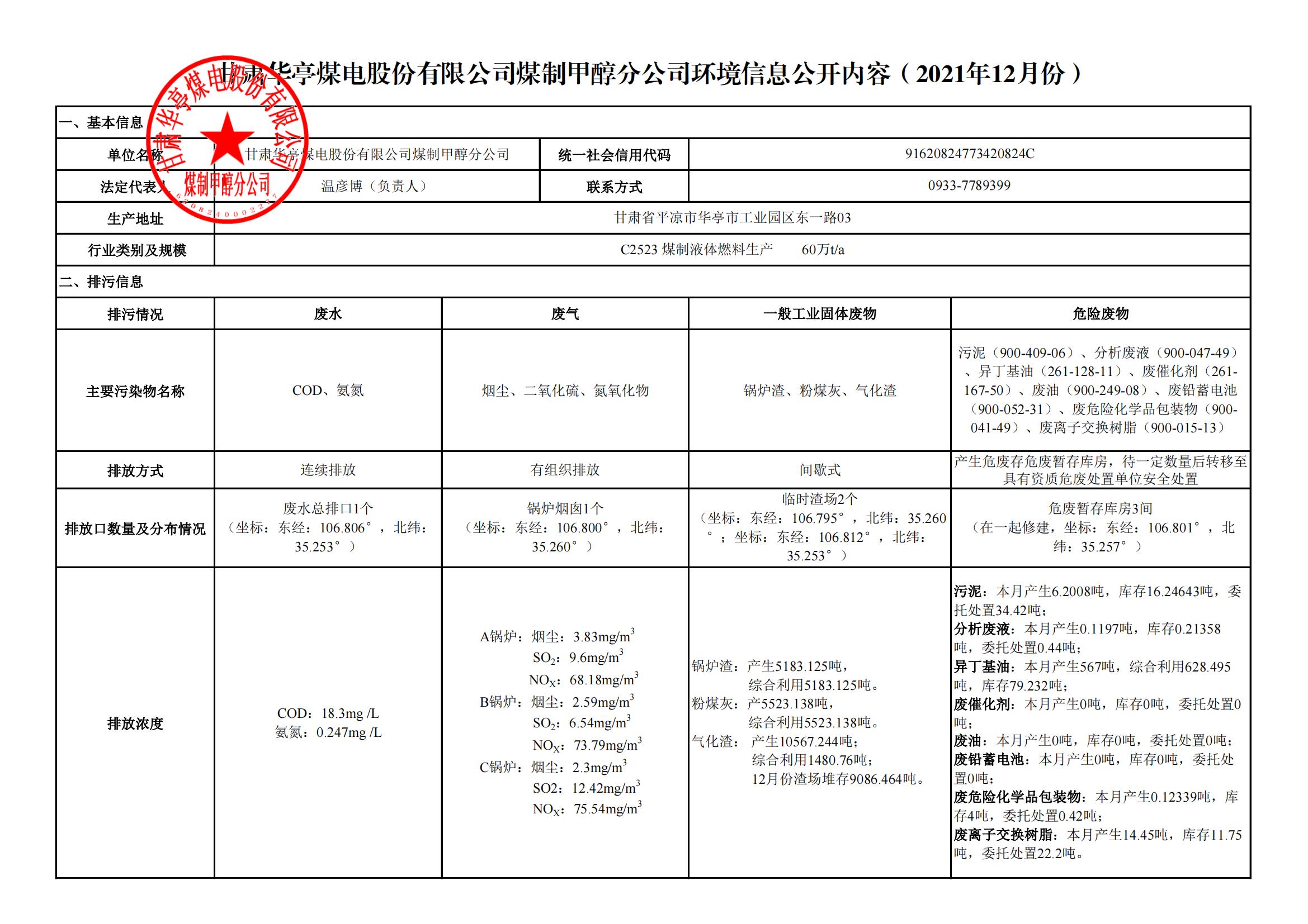 煤制甲醇分公司環(huán)境信息公開(kāi)內(nèi)容(2021年12月)